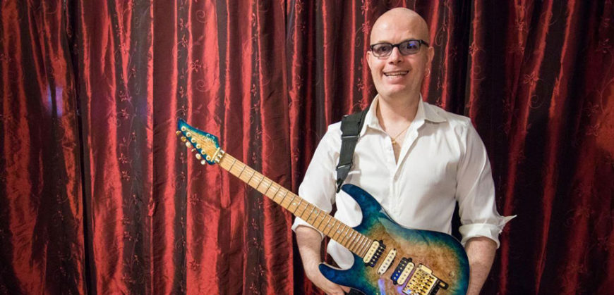 Vreny Van Elslande playing guitar at the ZOT Zin Music studio