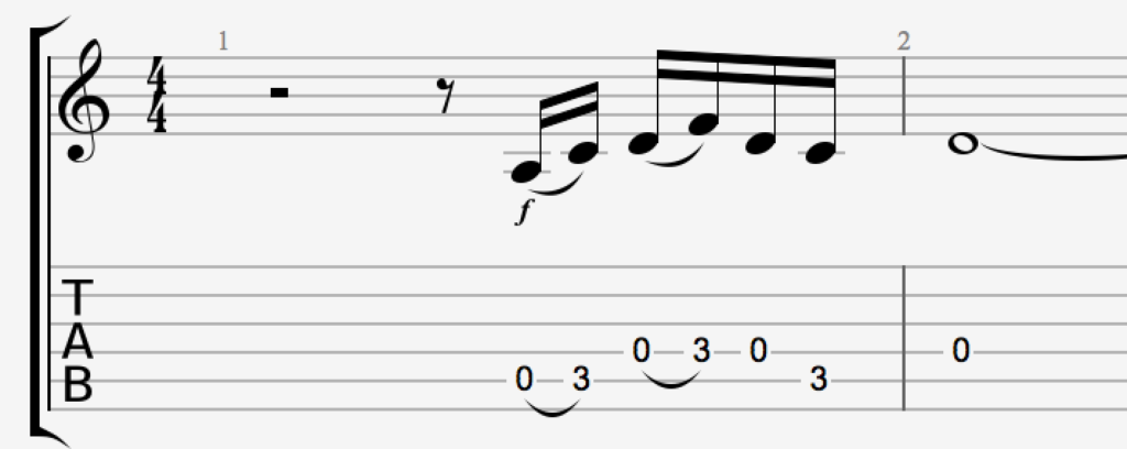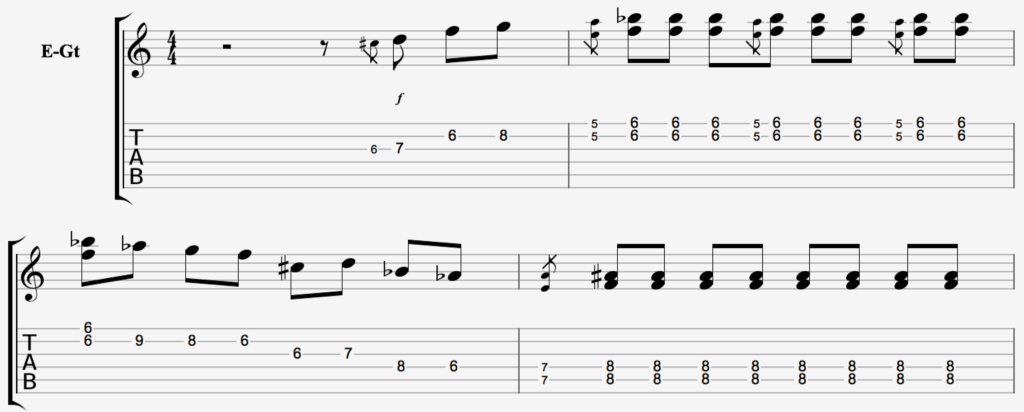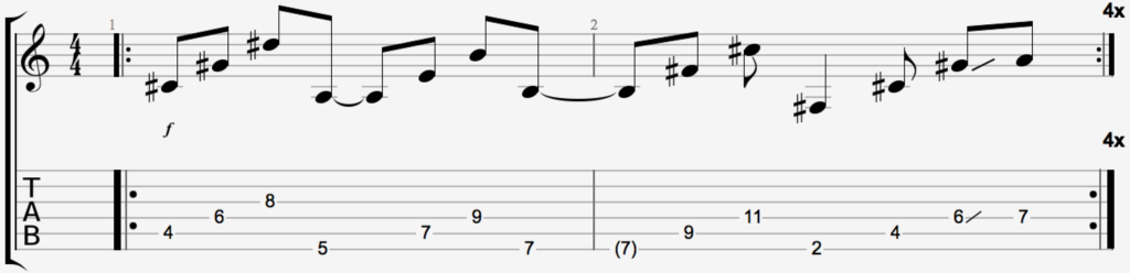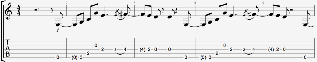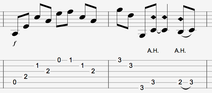 Arpeggios, harmonics, etc… there is a lot of music packed in this short riff. It’s also, as you may find out, a great picking exercise.