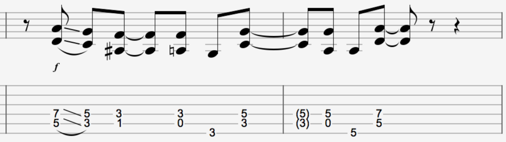 Fun riff with chromaticism. Slide the ending A chord up the fretboard.