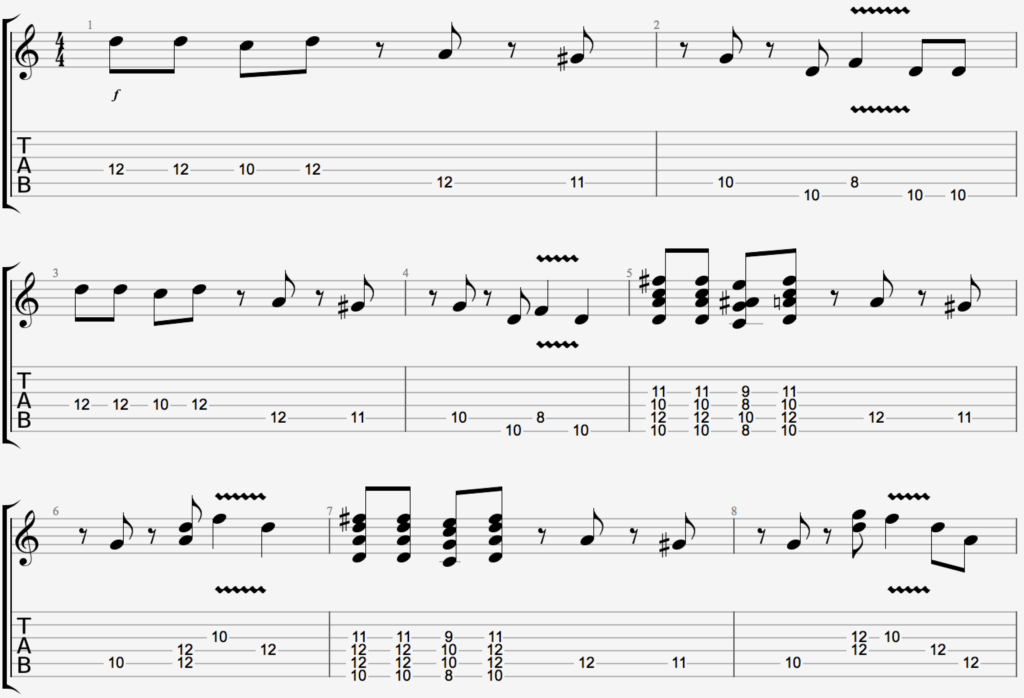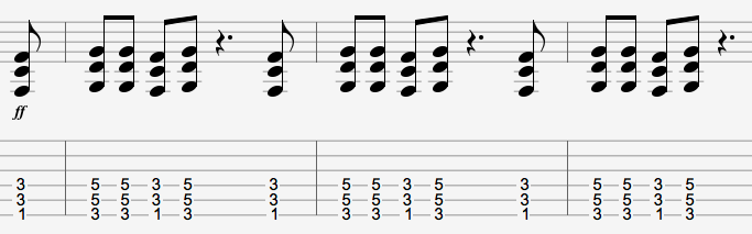 This Am chord is followed by an F triad. The riff ends with pinch harmonics on the bass strings.