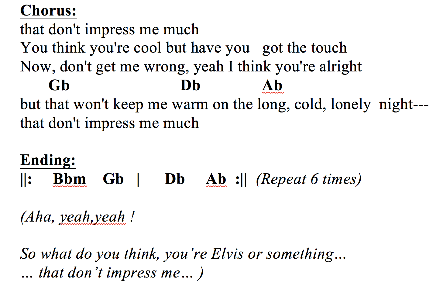 That Don’t Impress Me Much ending vreny+ | November 18, 2019← Return to Bar Chord Practice: Shania Twain “That Don’t Impress Me Much”‹Shania Twain’s hit song “That Don’t Impress Me Much” has pretty much all the same chords like David Bowie’s “Ashes to Ashes”