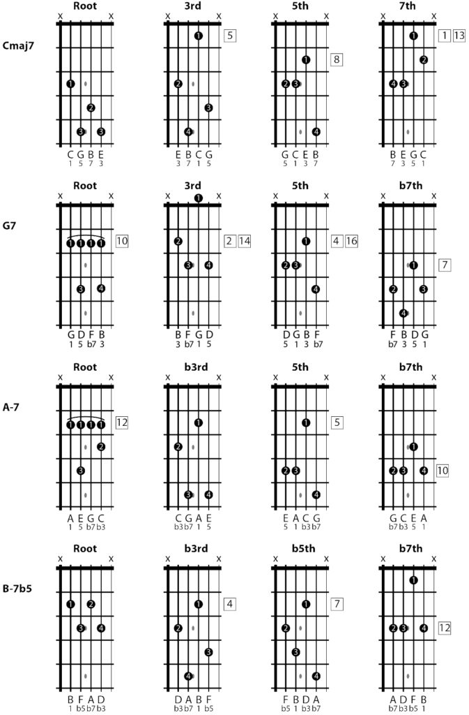 Move the Cmaj7 fingerings up 5 frets for Fmaj7 chords.