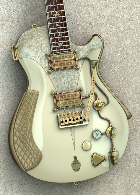 Steam Punk Theme Guitar Design vreny+ | April 6, 2021← Return to Cool Guitar Gear and Awesome Guitars‹›A creamy green-colored Steampunk guitar