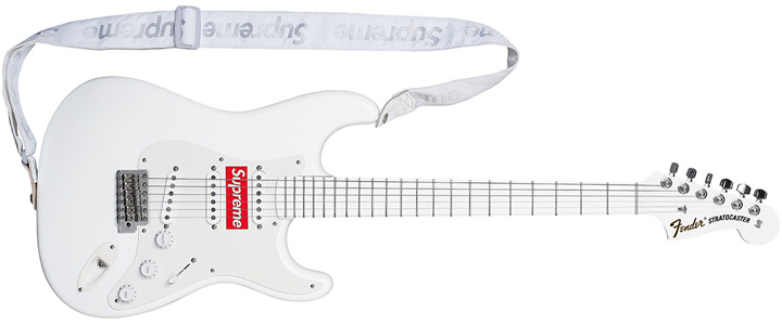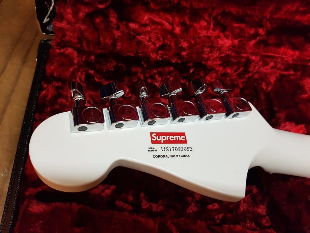 It also sports the Supreme logo on the body between the front two pickups. (Terrible, terrible, terrible idea)