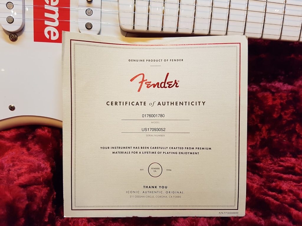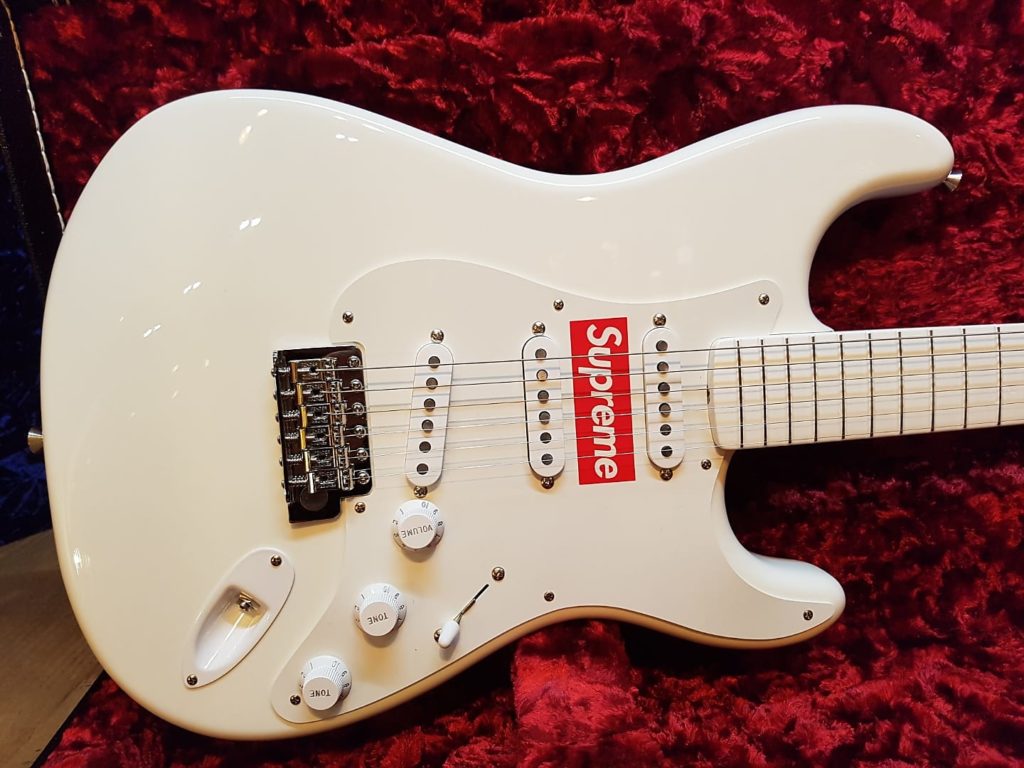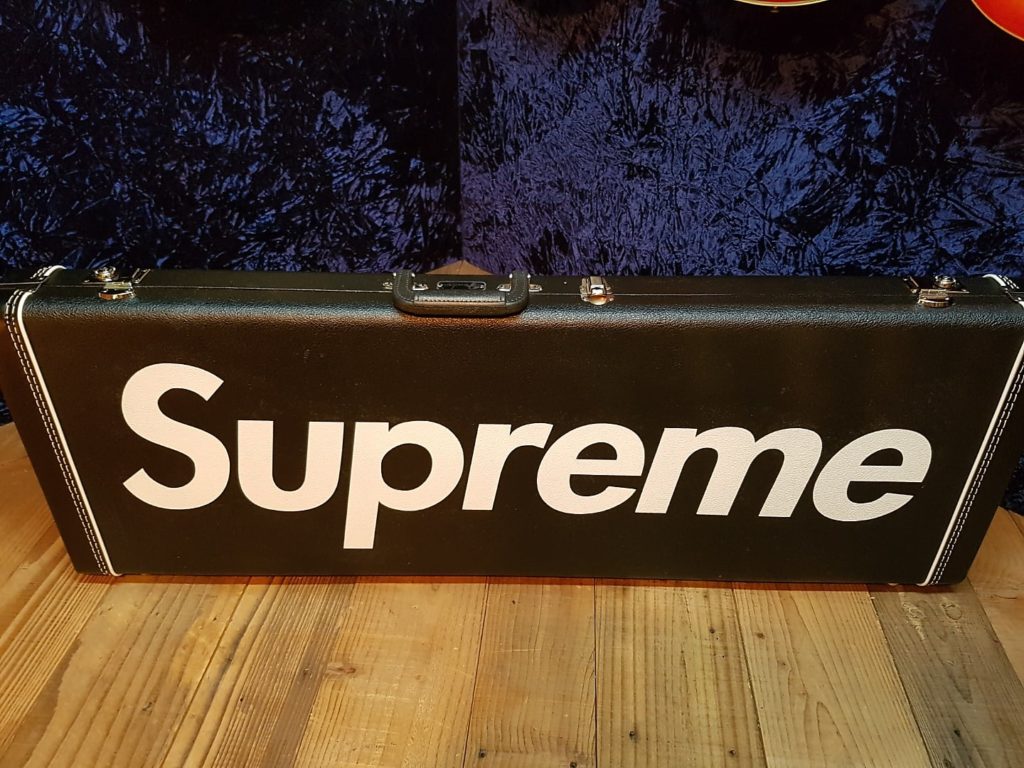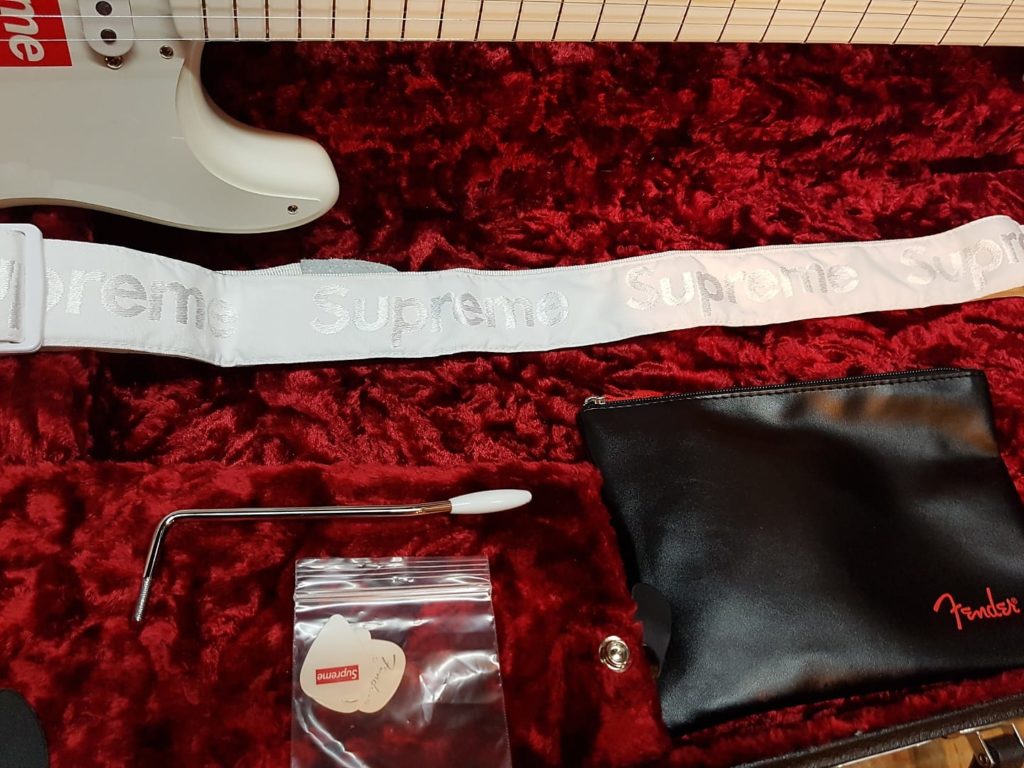 Supreme is supposedly well–known for its collaborations with other companies, and this guitar includes a Supreme–branded case, strap, and picks.