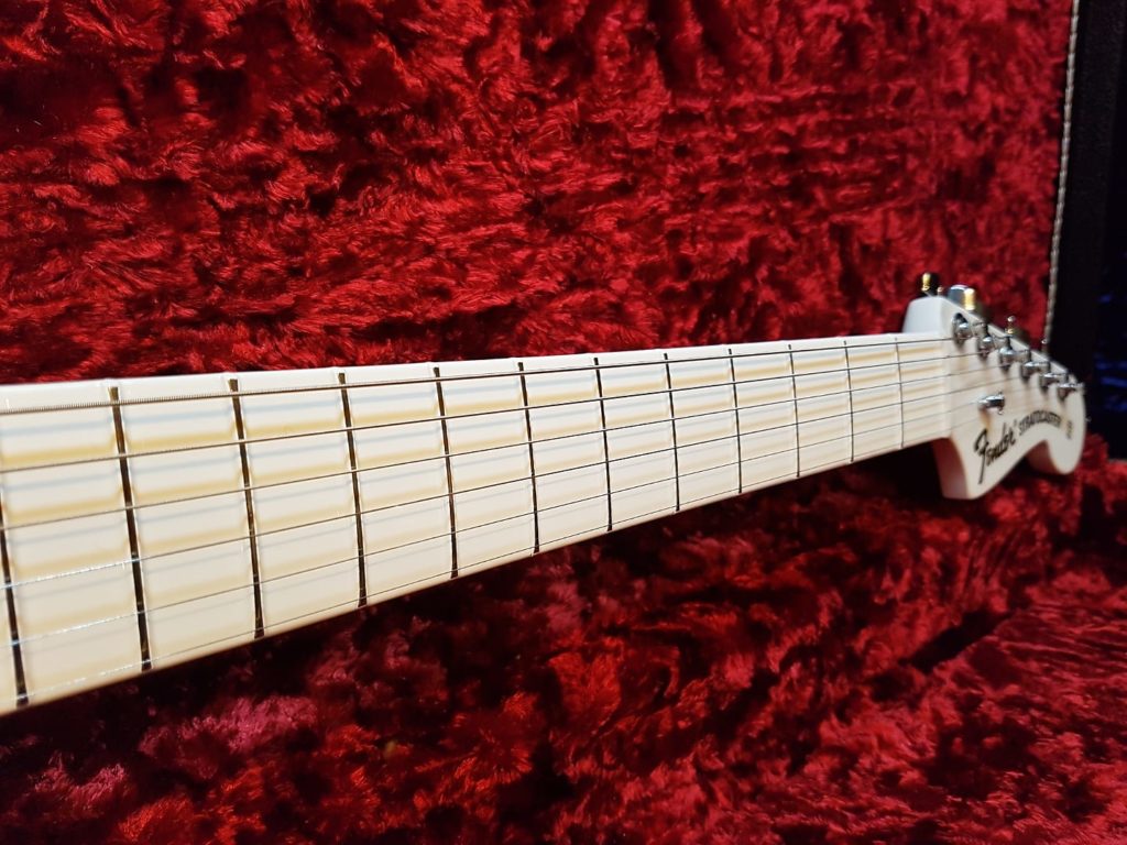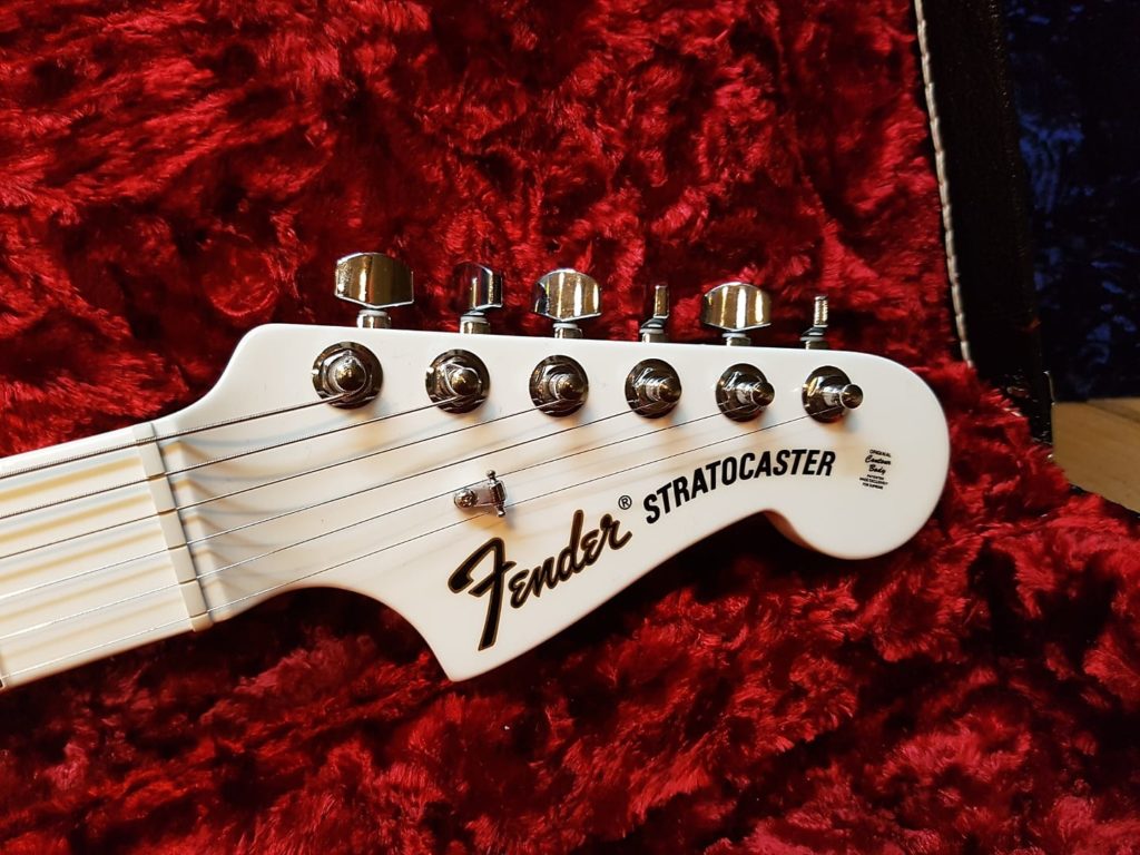 Such an unbelievable, crying shame though, that this white Strat has this silly red sticker.