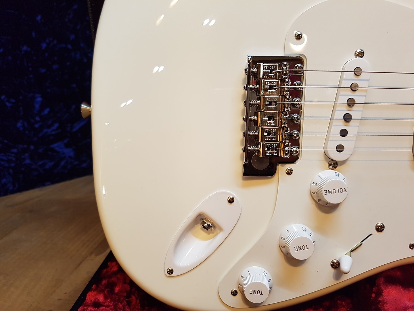 Close up of the all-white Supreme Limited Edition Stratocaster. If only the guitar didn’t have the darn red “Supreme” logo between the picks, which diminishes the guitar’s immaculate beauty