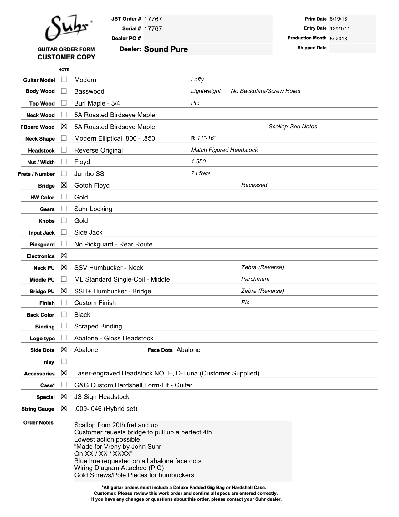 17767 spec sheet vreny+ | August 19, 2013← Return to Creation of my Custom Dream Guitar (Part 4, the Final Installment: The Spec Sheet)‹The order and spec sheet of Vreny’s 2nd Suhr Modern guitar