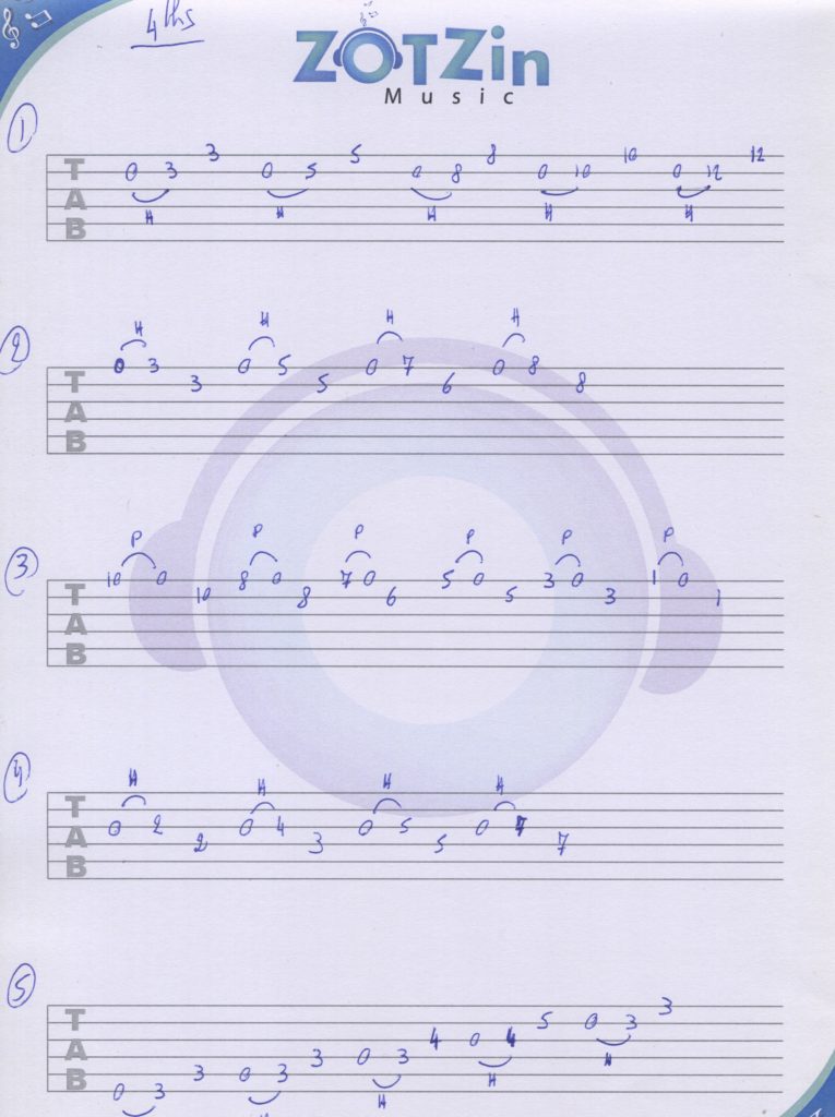 In the following ideas, all in the key of C or A minor hit/pick an open string, then hammer onto any note of a C major scale onto that string, then play a 3rd above that note on the next string.