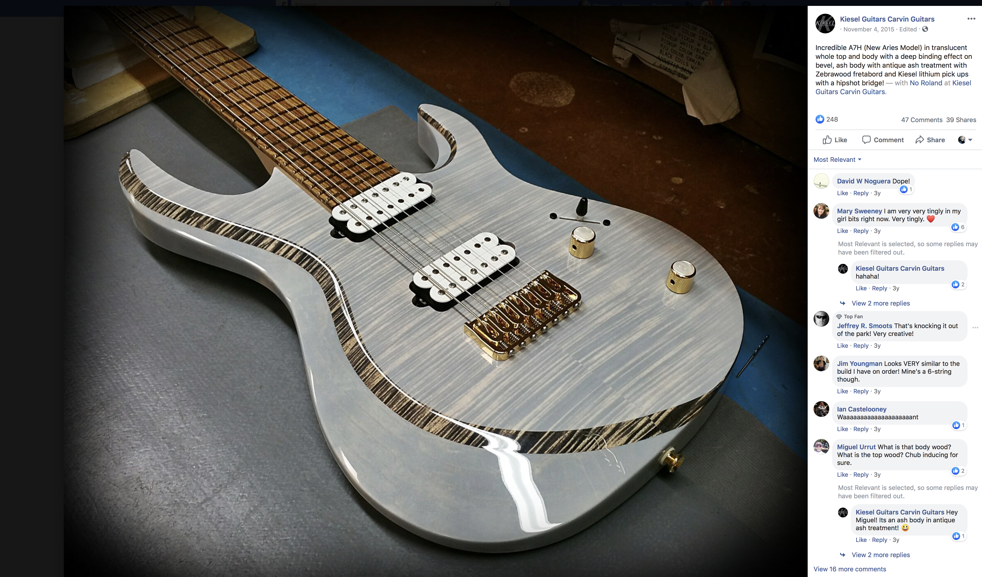 That light-frey, those wood flames, the gold hardware and gold line running across the body, and the white pick ups, absolutely visual perfection. So beautiful