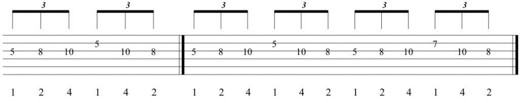The 3rd example uses the same idea as example 2 but starts on an F note instead of on E. This trains and works different finger muscles in the fretting hand.