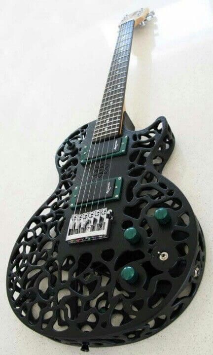 Guitar with Holes vreny+ | March 19, 2021← Return to Guitars and Jokes I Love‹›Hollowed out black Les Paul riddled with randomly shaped holes.