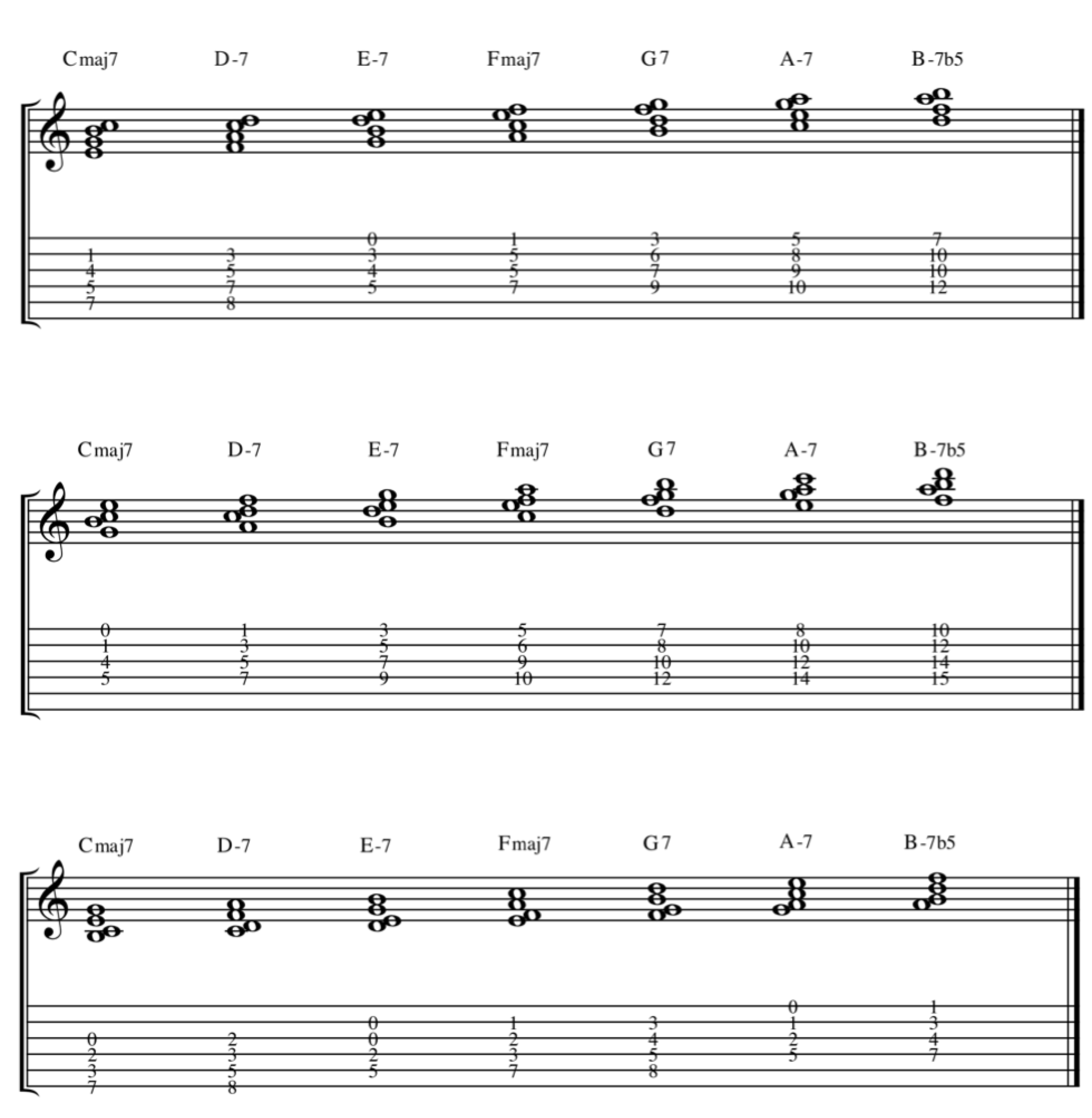 Closed position 7th chords vreny+ | October 28, 2019← Return to How to Play Closed Voiced 7th Chords on Guitar‹›3rd, 5th and 7th in the bass closed voicings for all chords in the key of C.