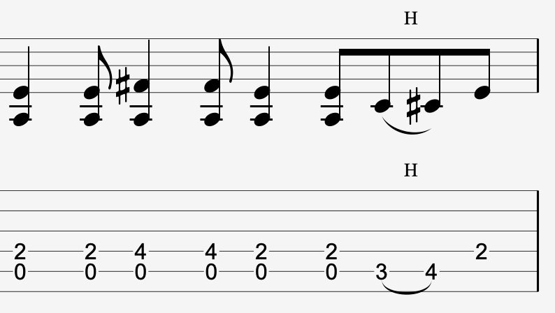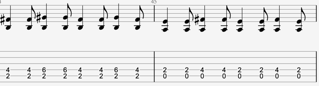 This riff repeats for a very long time, all the way to 1:11, then moves down a string towards the floor and plays the same riff 4 times with the open A string.