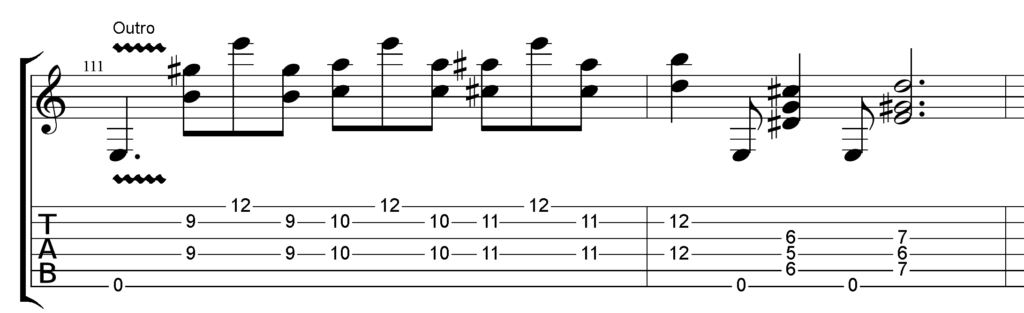In the following video, you can see how to play it all. In addition to that video and the above transcriptions, check out the aforementioned blog pages by clicking on the posted URLs if you want to see a more detailed explanation of how to play those parts.