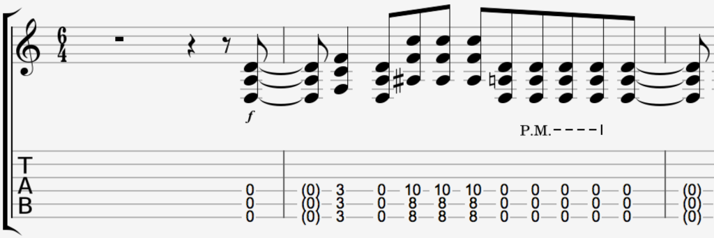 - Ending Part 2: 4 bars (4/4), 8 C power chord hits per bar