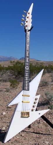 A custom White Thunderbolt shaped guitar