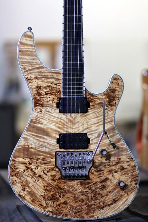 This guitar is a piece of art: amazing wood, gorgeous shiny abalone binding, black pick ups and bridge that looks like it could be Floyd Rose