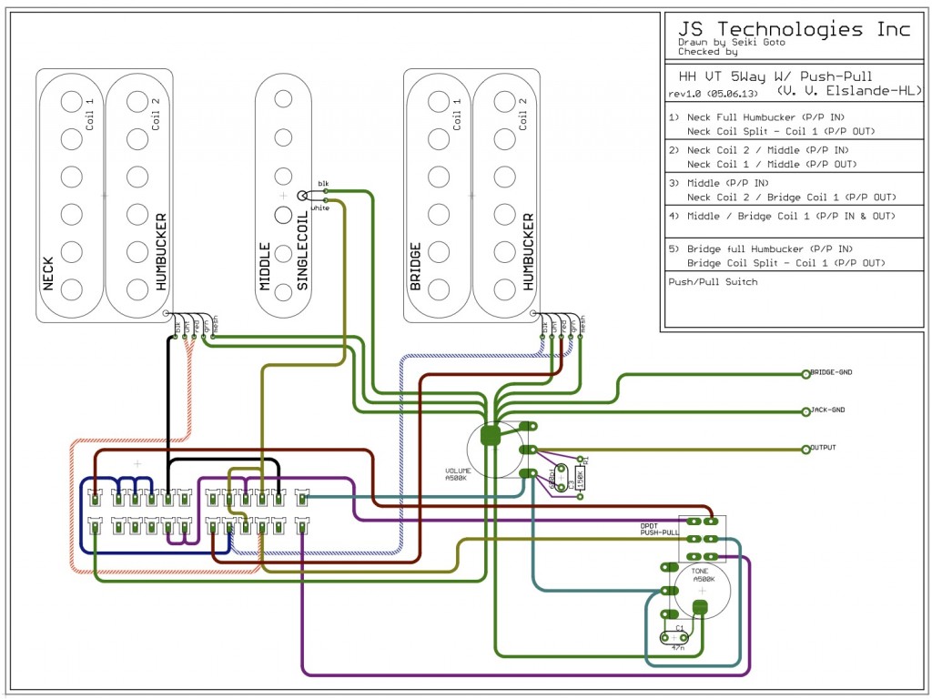 Finally having made up my mind that the guitar had to have a humbucker – single coil – humbucker (hsh) configuration, it was time to figure out which wiring configurations I wanted.