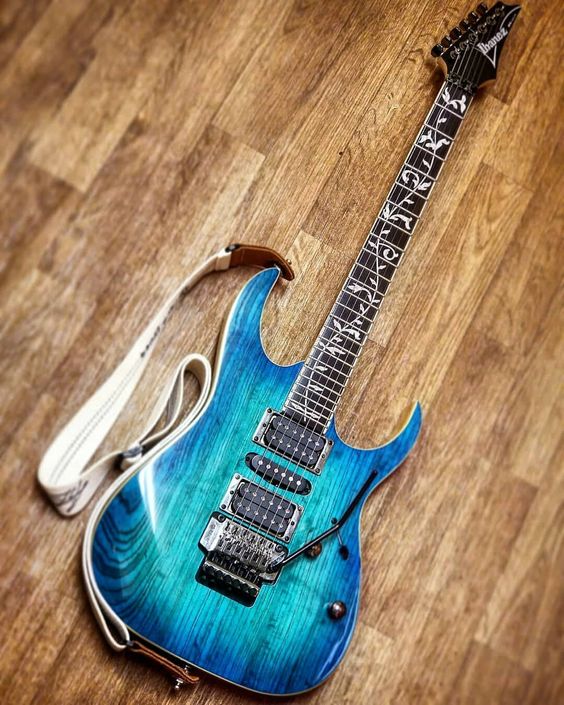 Nice Blue Ibanez vreny+ | November 21, 2019← Return to Nice Guitars and Fun Musician Stuff‹›A blue burst (light blue to dark blue) Ibanez superstrat with chrome Floyd Rose and black pick ups
