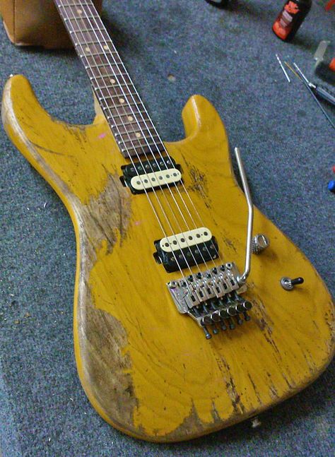 Worn down stained yellow Strat style guitar with Floyd Rose. It has zebra cream-black humbuckers.