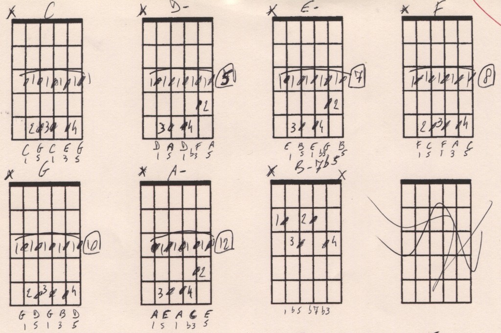 Here’s all 7 chords in the key of C played with A shape bar chords: