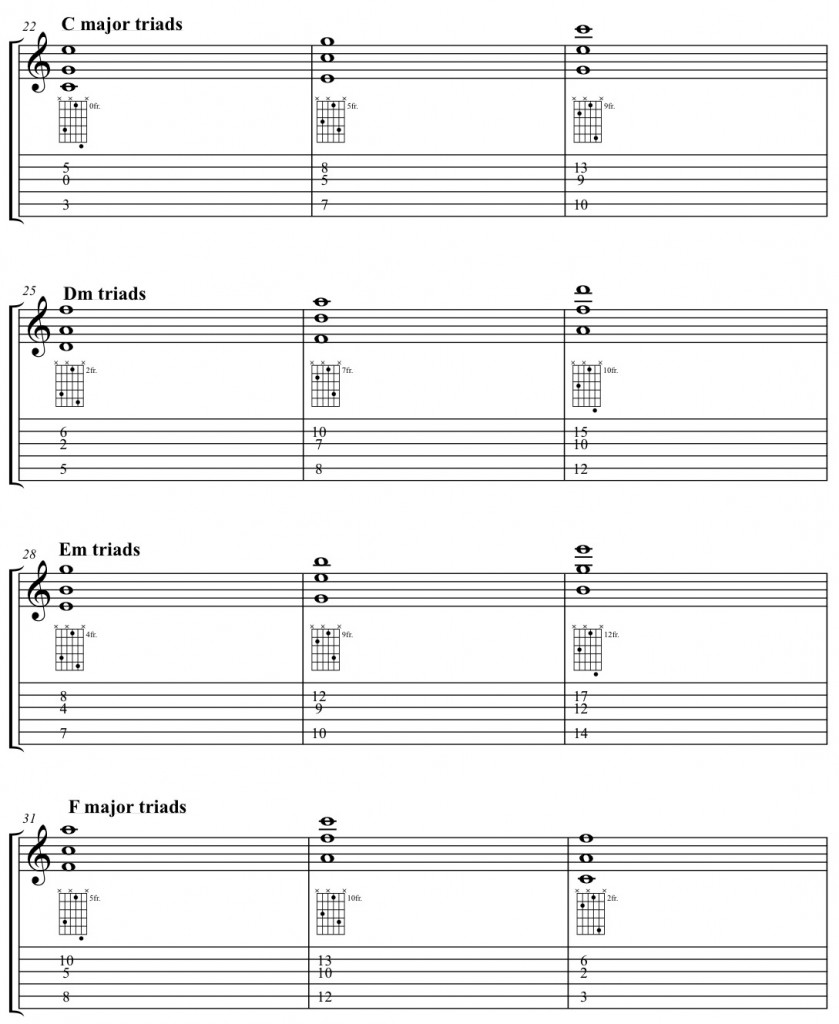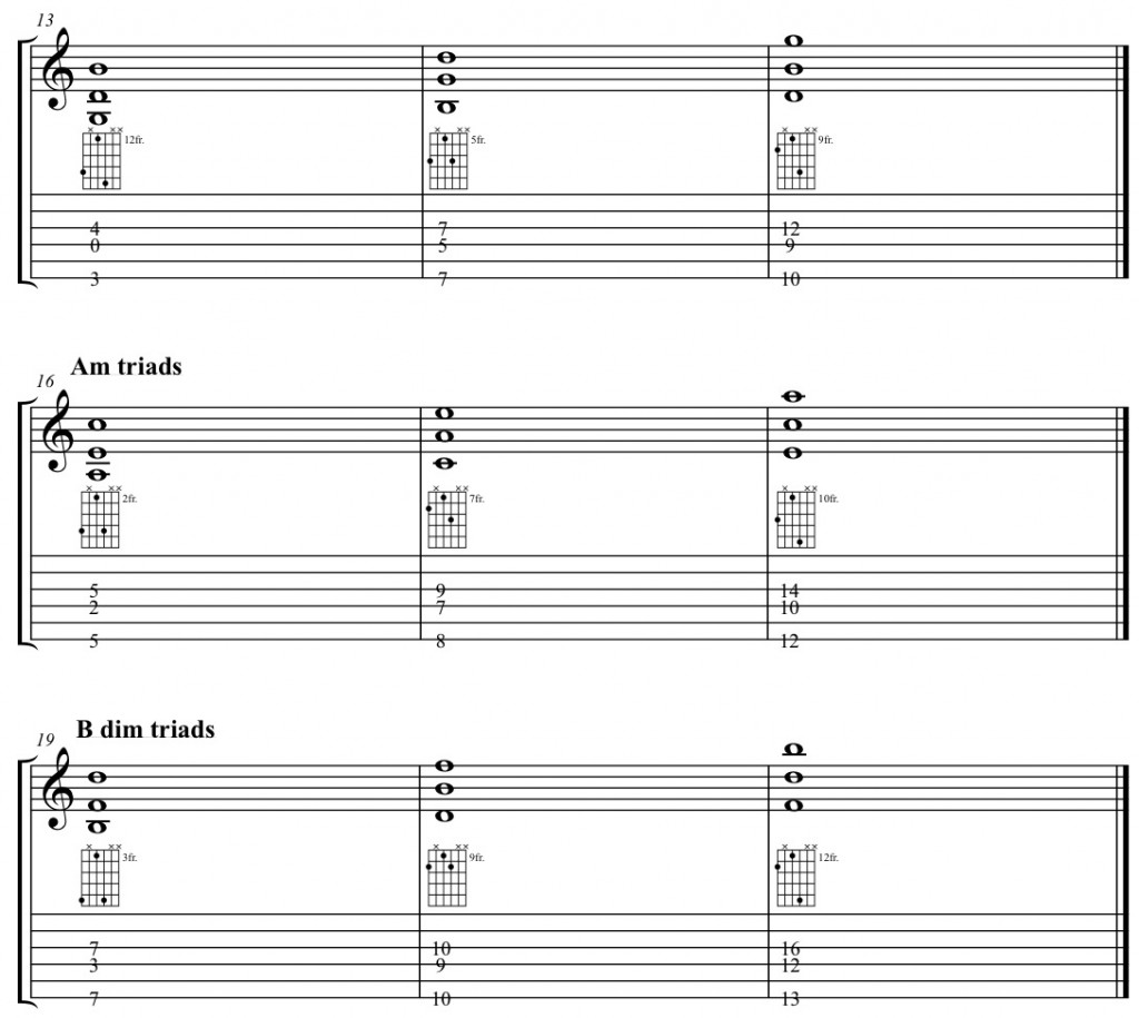 Closed triads (also called “closed voicings”), are 3-note chords in which all 3 notes fall within an octave. In other words: the distance between the lowest note and the highest note in the chord is less than an octave.