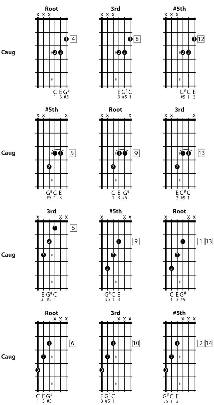 c-aug-triads-all-stringsets vreny+ | January 25, 2017← Return to The Augmented TriadC augmented triad chord fingerings on all stringsets