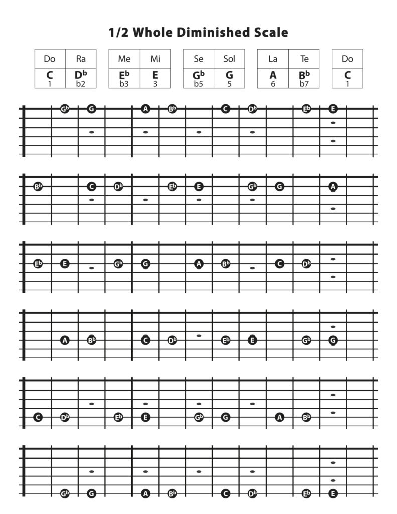 Here’s the C 1/2 Whole Dim Scale mapped out on every string.