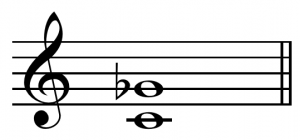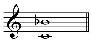 The minor seventh interval, relative to middle C, looks like this on the staff: