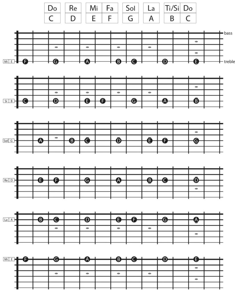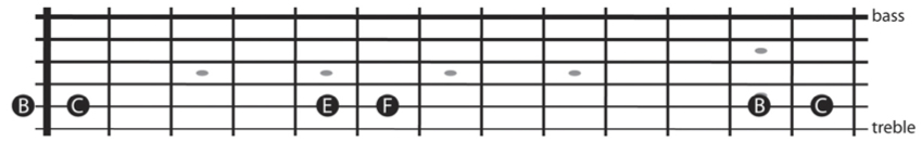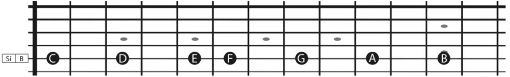 The above guitar neck picture shows that the half steps in a C major scale are located from E to F, and from B to C.