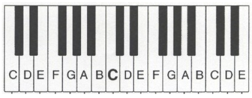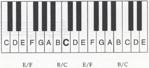 The following piano keyboard shows how E-F and B-C are also adjacent keys on a keyboard.