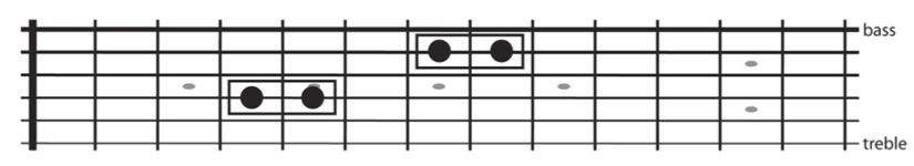 Each step from 1 key to the adjacent key on the piano is called a “half step” in music theory. The “half step” is the smallest interval we have in our music. The adjacent keys on a piano correspond to adjacent frets on a guitar. The spaces in between the notes on the above guitar fretboard correspond to the black keys on a piano.