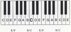 ef-bc-on-piano vreny+ | February 1, 2017← Return to The Major Scale‹›A piano keyboard showing the EF and BC half step locations