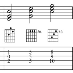 - The 10/9/8 shape (10th fret, 9th fret, 8th fret) is what you call “root position”. The notes from low to high are C E G (root, 3rd, 5th). Whenever you play that shape on these 3 strings, you play a major chord with the root as the lowest note.