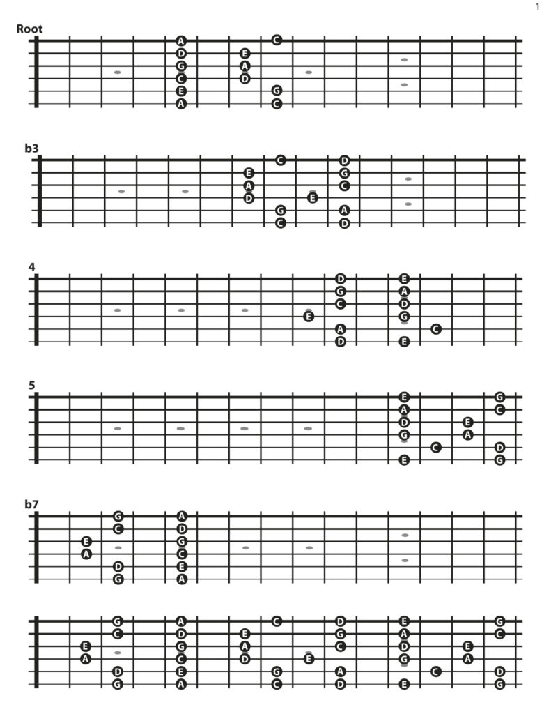 Here’s how the 5 fingerings look like with their names. (The lowest guitar neck shows all fingerings on 1 guitar neck)