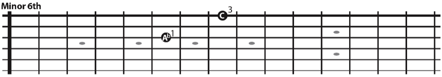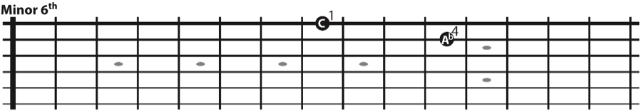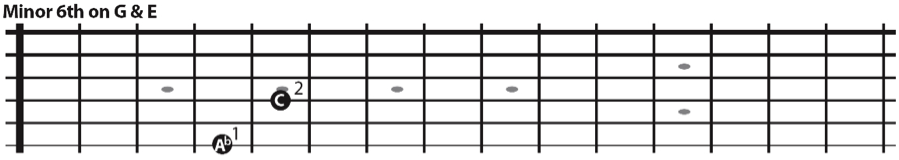 The following example shows how you play a minor 6th interval on 2 adjacent strings.