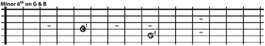 Rarely does a guitar player play minor 6th intervals on the G and B strings, but it is still physically possible to do so, though less practical. Here’s how minor 6ths look like on the 2nd and 3rd string: