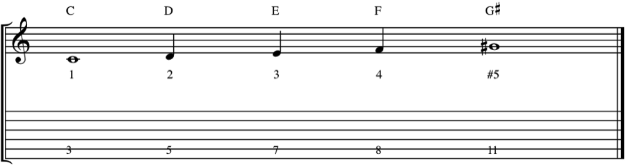 The following example shows that the enharmonic spelling for Ab, which is G#, results in an augmented 5th interval. This interval is not to be found in a major scale but can be found in other scales that are used in jazz improvisation…