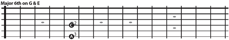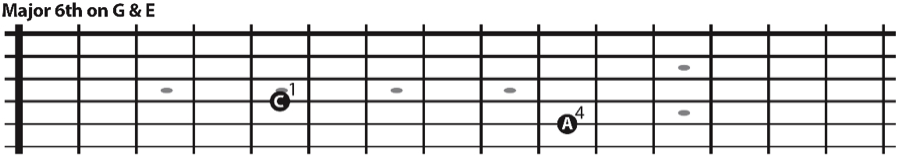 Following guitar neck shows the fingering for major 6ths as they are played on the D&B and G&E string sets.