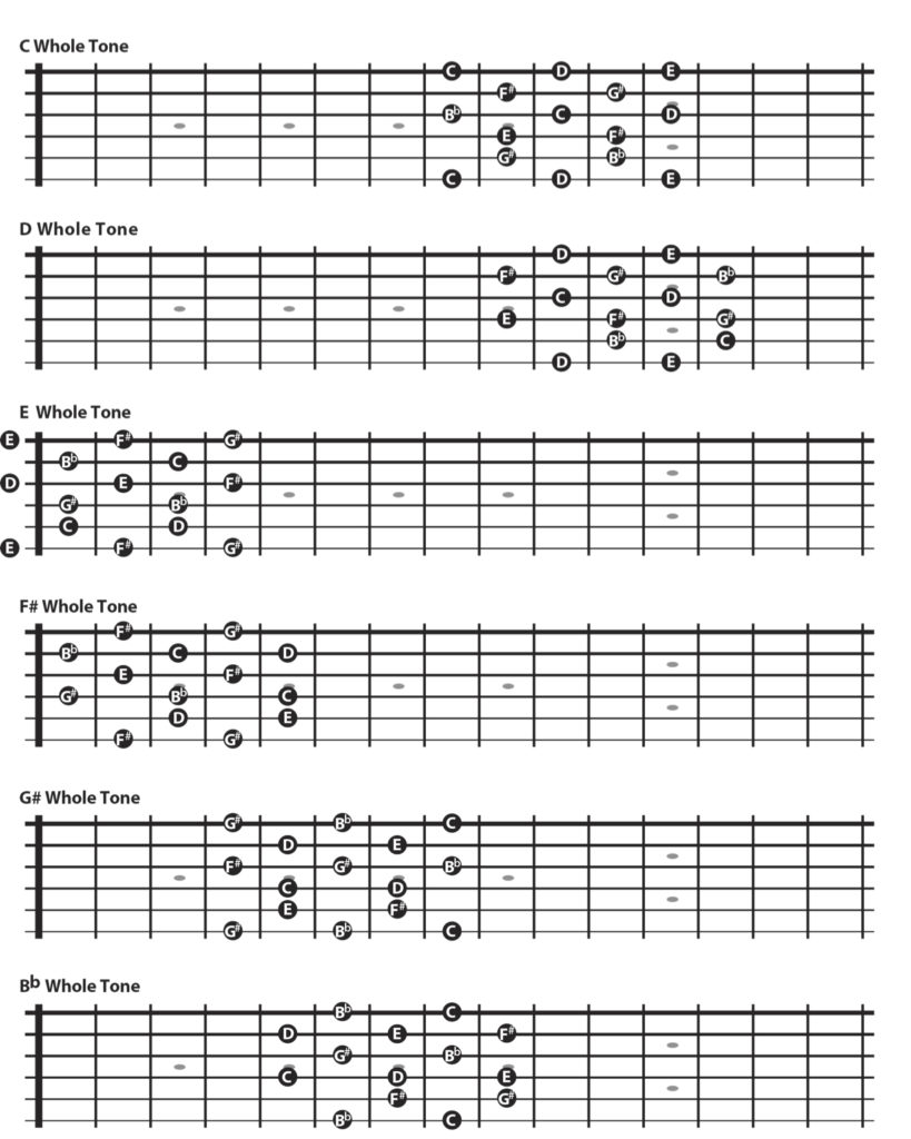 Since it is a symmetrical scale, that means that the C whole tone scale, is also a D whole tone scale, an E whole tone scale, F#, G#, and Bb whole tone scale.
