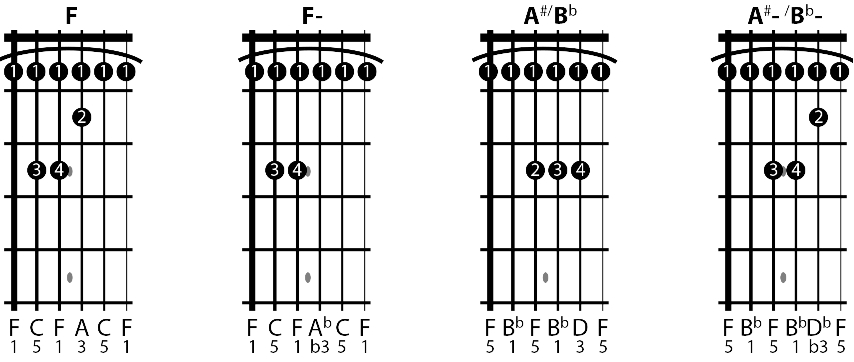 Or another way to look at it: you place your index on the black open string dots (as seen in the above graphic), and then move your index finger (as a bar that you place over all strings) along with the fingers on the strings that make up the E, E-, A, and A- shapes.