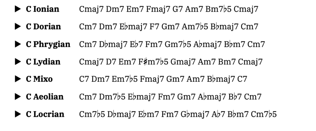 While the above examples list some of the most common chord progressions for each mode, it’s fun to experiment, coming up with your own progressions. To that end, here are all the chords for each mode in the key of C.