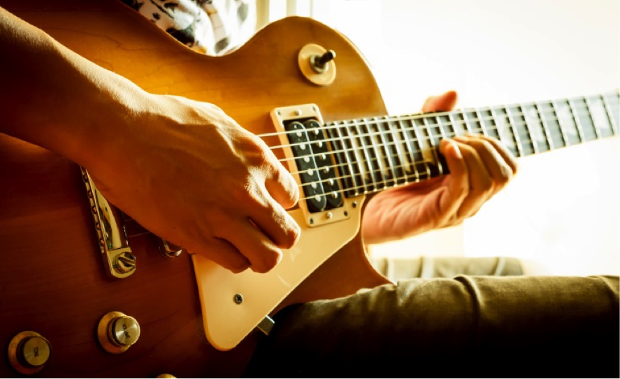 a stock photo showing someone playing a golden Les Paul guitar
